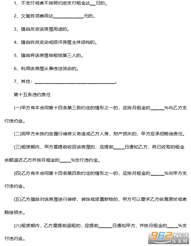 (四)乙方有本合同第十四条第四款约定的情形之一的,应按月租金的▁▁▁▁▁%向甲方支付违约金。