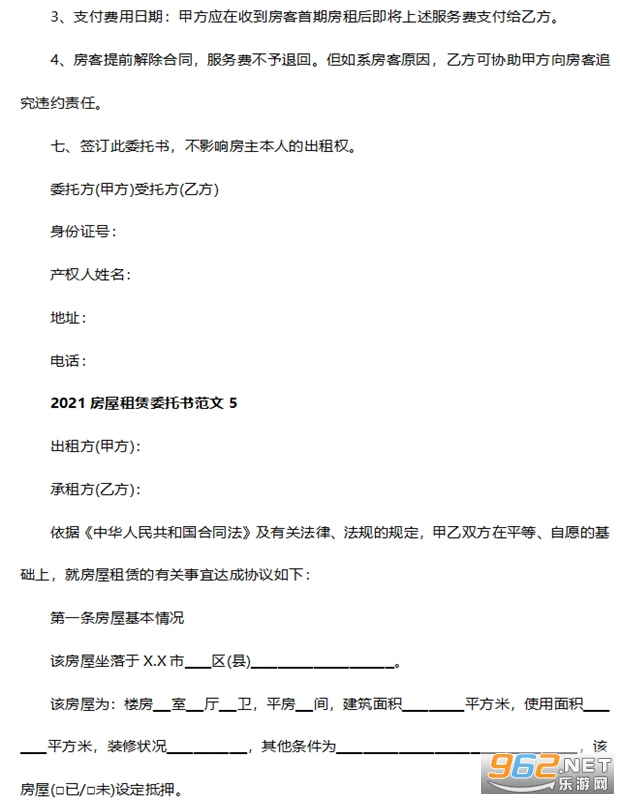 4、房客提前解除合同,服务费不予退回。但如系房客原因,乙方可协助甲方向房客追究违约责任。