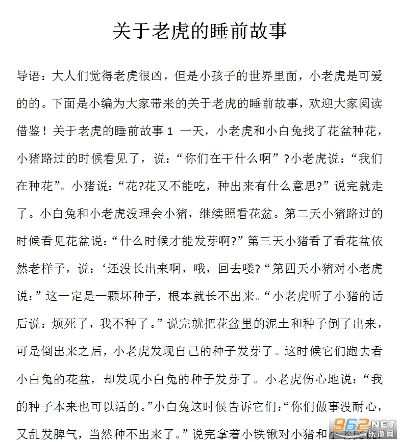 《关于老虎的睡前故事》是小编在网上收集到的关于老虎的睡前故事,故事一共有三篇,每一篇都是不错的,而且篇幅都不长,看上去不会觉得累,而且故事的走向都是很不错的,感兴趣的亲们赶紧下载吧。
