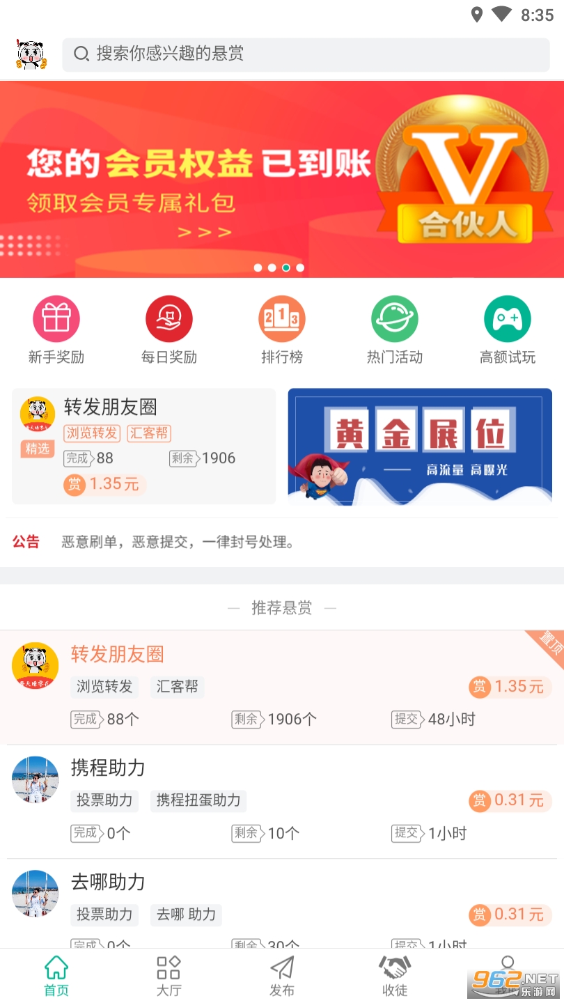汇客帮-是一款做悬赏任务赚钱APP,从界面上看比较类似于兼蛋、蜂赏等悬赏平台,新人也能快速上手,更受新手任务奖励祝你赚钱更轻松。汇客帮app下载安装后,填写邀请码:2005437就有丰厚礼包等你领取,通过完成平台内的悬赏任务,就能赚取零花钱,做的越多赚的也就越多,还有新手奖励、每日奖励、排行榜奖励等等,让你获得额外的现金收益,最低2元即可提现,100元以内秒到账,感兴趣的朋友快来下载汇客帮做悬赏任务赚钱吧!