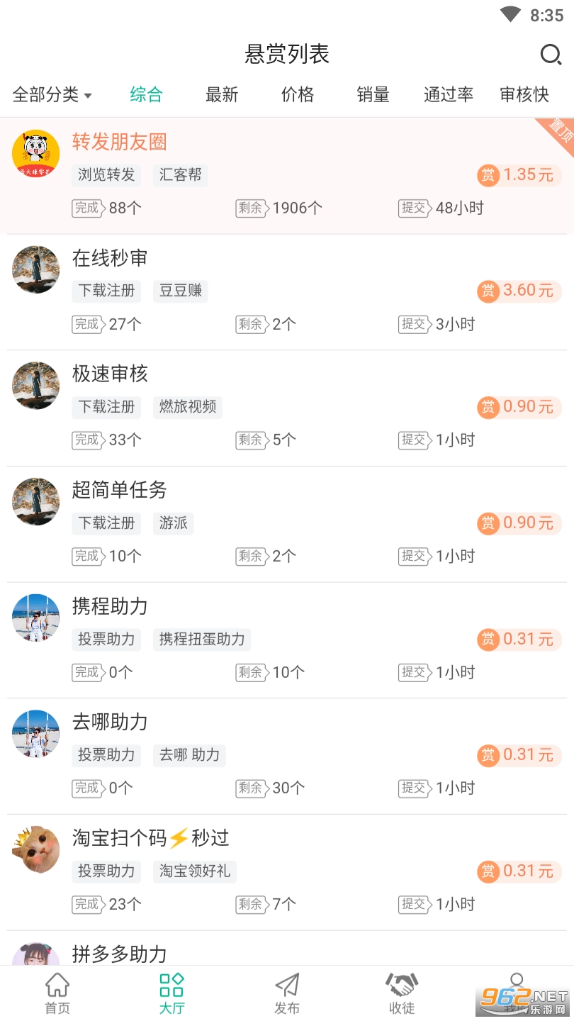 1、汇客帮任务大厅里面有海量的悬赏任务等你完成,主要有关注投票、下载注册、砍价助力、浏览转发、认证绑卡等类型