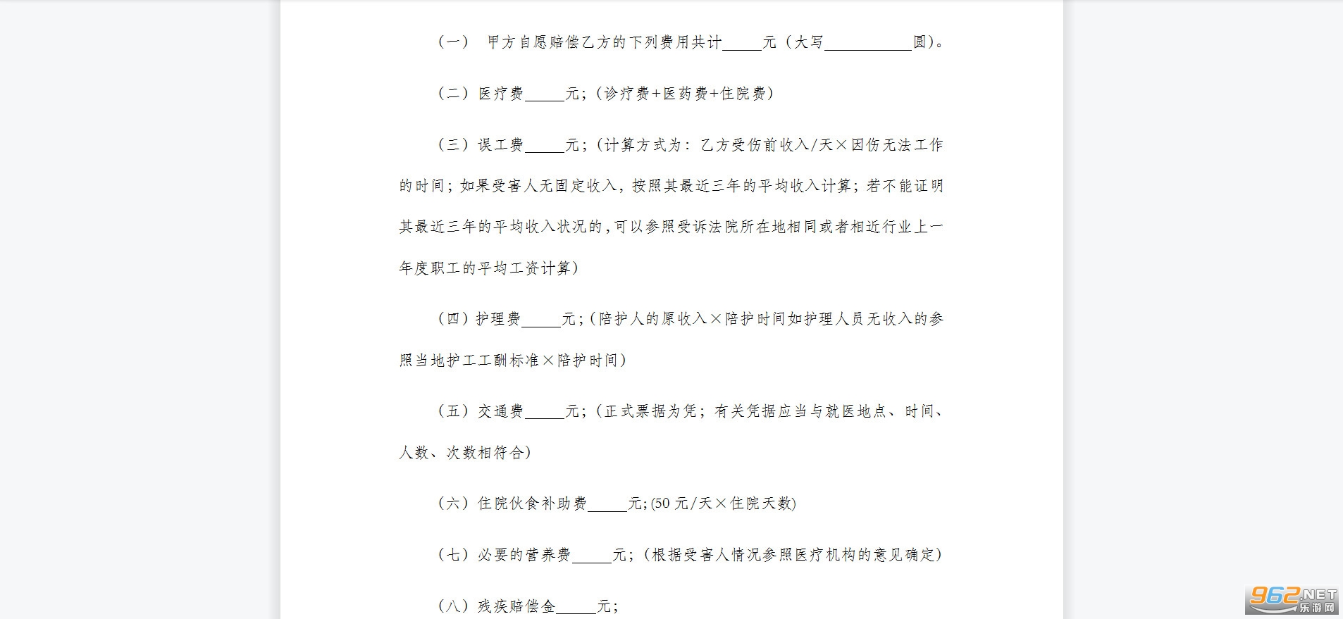 (一) 甲方自愿赔偿乙方的下列费用共计 元(大写 圆)。