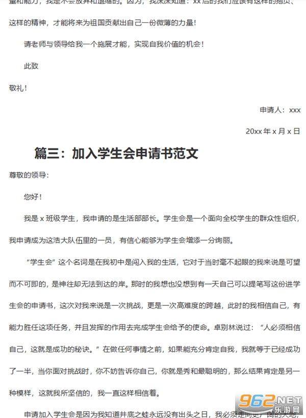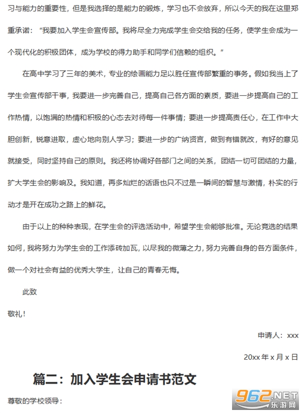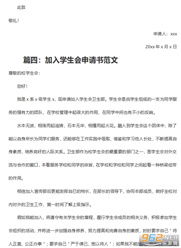 我是x系x级学生x,现申请加入学生会卫生部。学生会是由学生组成的一支为同学服务的强有力的团队,在学校管理中起很大的作用,在同学中间也有不小的反响。