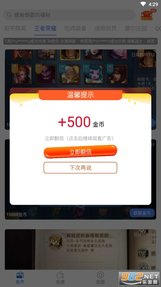 《荣耀训练营》是专门为喜欢玩游戏的朋友打造的一款手机领皮肤神器,里面拥有丰富的功能让大家去体验,在这里你可以通过看广告,养鱼等方式来获取金币,免费领取王者荣耀,迷你世界,摩尔庄园,吃鸡等游戏里面的皮肤,操作方便简单,有需要的朋友赶快来下载吧!