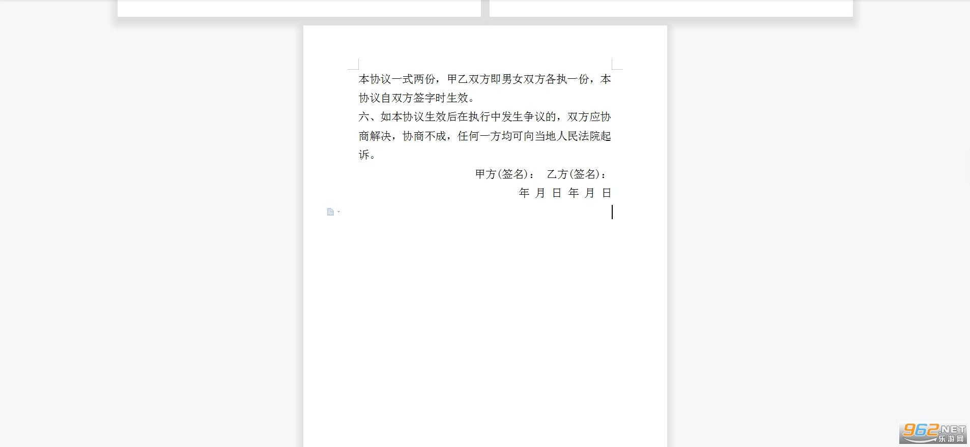 本协议一式两份,甲乙双方即男女双方各执一份,本协议自双方签字时生效。