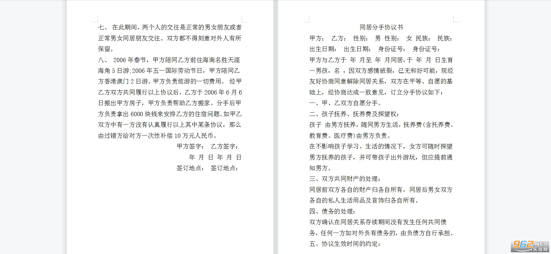 同居分手协议书有效