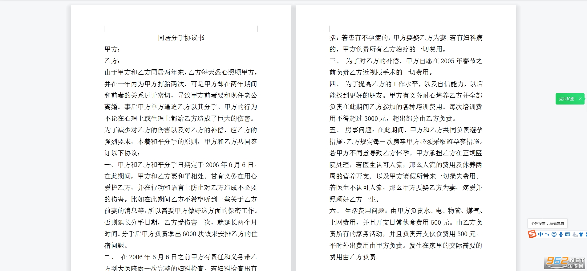 一、甲方和乙方和平分手日期定于2006年6月6日。在此期间,甲方和乙方要和平相处。甘有义务在用心爱护乙方,并在行动和语言上防止对乙方造成不必要的伤害。比如在此期间乙方不希望听到一些关于乙方前妻的消息等,所以需要甲方做好这方面的保密工作。否则延长分手日期,乙方受伤害一次,就延长两个月时间。分手后甲方负责拿出6000块钱来安排乙方的住宿问题。