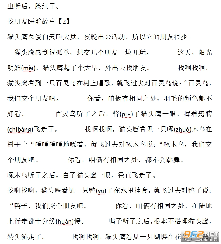 猫头鹰(yīnɡ)总爱白天睡大觉,夜晚出来活动,所以它的朋友很少。&8194;&8194;&8194;&8194;&8194;&8194;&8194;猫头鹰感到很孤单,想交几个朋友一块儿玩。&8194;&8194;&8194;&8194;&8194;&8194;&8194;这天,阳光明媚(mèi),猫头鹰起了个大早,外出去找朋友。&8194;&8194;&8194;&8194;&8194;&8194;&8194;找啊找啊,猫头鹰看到一只百灵鸟在树上唱歌,就飞过去对百灵鸟说:“百灵鸟,我们交个朋友吧。&8194;&8194;&8194;&8194;&8194;&8194;&8194;你看,咱俩有相同之处,羽毛的颜色都不好看。&8194;&8194;&8194;&8194;&8194;&8194;&8194;百灵鸟听了之后,瞥(piē)了猫头鹰一眼,挥着翅膀(chìbǎnɡ)飞走了。&8194;&8194;&8194;&8194;&8194;&8194;&8194;找啊找啊,猫头鹰看见一只啄(zhuó)木鸟在树干上“噔噔噔噔地啄着,就飞过去对啄木鸟说:“啄木鸟,我们交个朋友吧。&8194;&8194;&8194;&8194;&8194;&8194;&8194;你看,咱俩有相同之处,都不会跳舞。&8194;&8194;&8194;&8194;&8194;&8194;&8194;啄木鸟听了之后,白了猫头鹰一眼,径直飞走了。