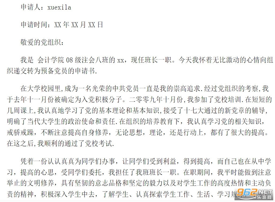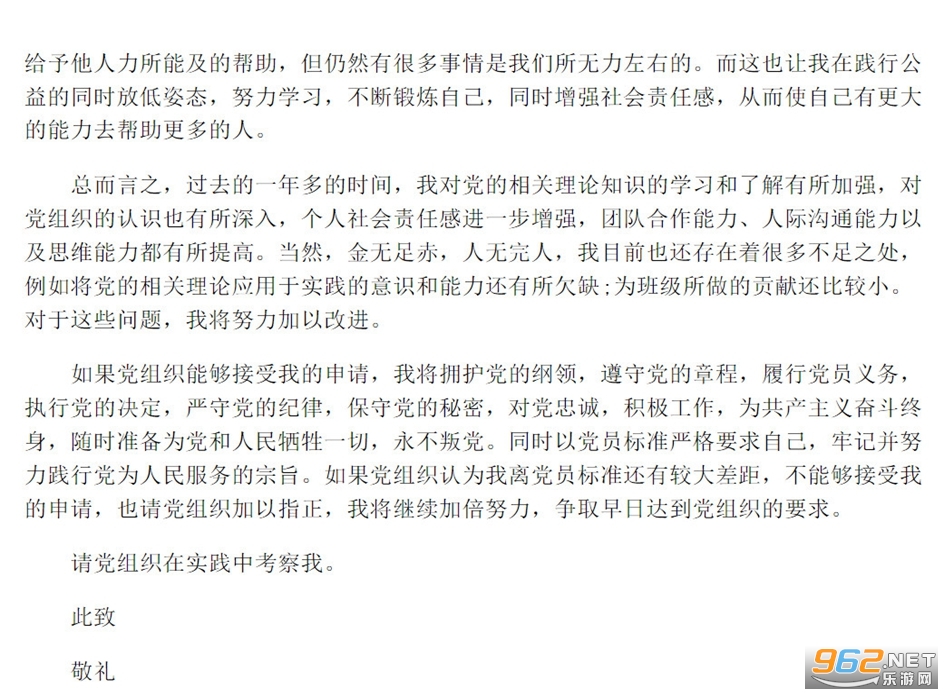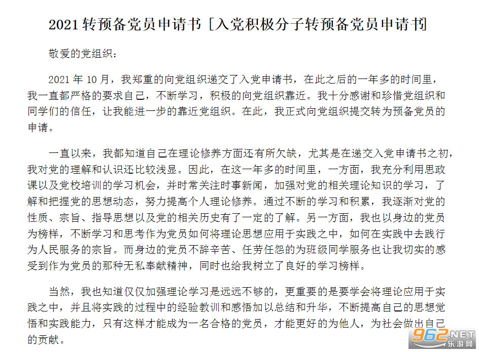 2026年10月,我郑重的向党组织递交了入党申请书,在此之后的一年多的时间里,我一直都严格的要求自己,不断学习,积极的向党组织靠近。我十分感谢和珍惜党组织和同学们的信任,让我能进一步的靠近党组织。在此,我正式向党组织提交转为预备党员的申请。