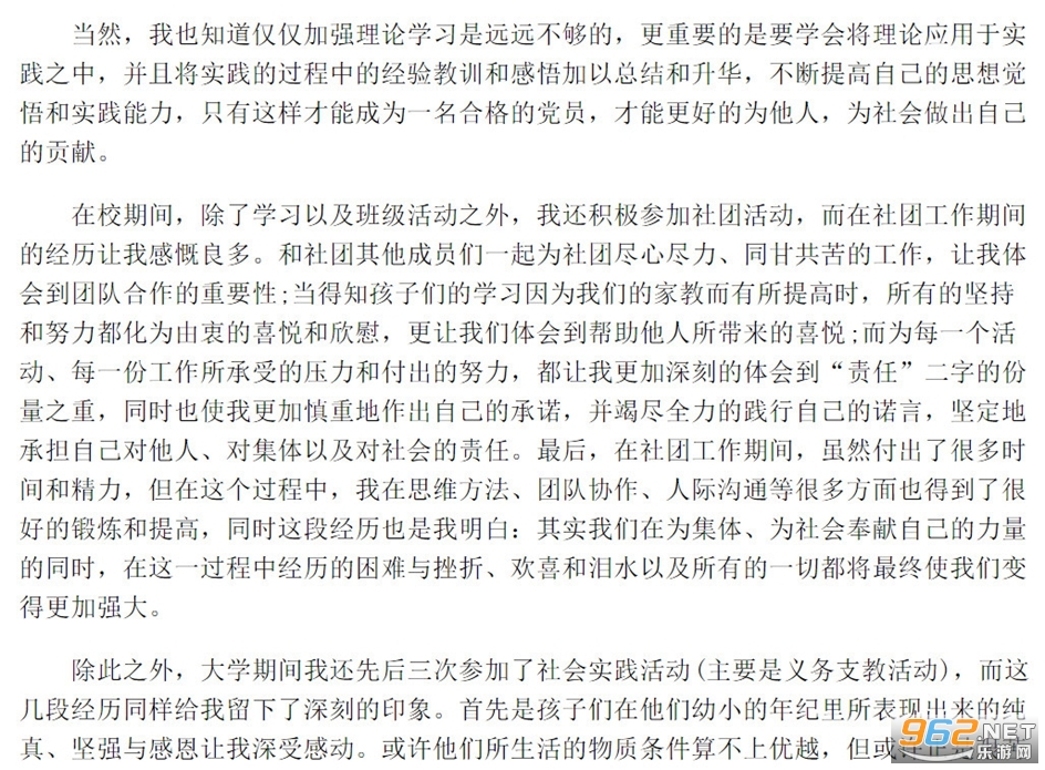 给予他人力所能及的帮助,但仍然有很多事情是我们所无力左右的。而这也让我在践行公益的同时放低姿态,努力学习,不断锻炼自己,同时增强社会责任感,从而使自己有更大的能力去帮助更多的人。&8194; &8194;&8194;&8194;&8194;总而言之,过去的一年多的时间,我对党的相关理论知识的学习和了解有所加强,对党组织的认识也有所深入,个人社会责任感进一步增强,团队合作能力、人际沟通能力以及思维能力都有所提高。当然,金无足赤,人无完人,我目前也还存在着很多不足之处,例如将党的相关理论应用于实践的意识和能力还有所欠缺;为班级所做的贡献还比较小。对于这些问题,我将努力加以改进。