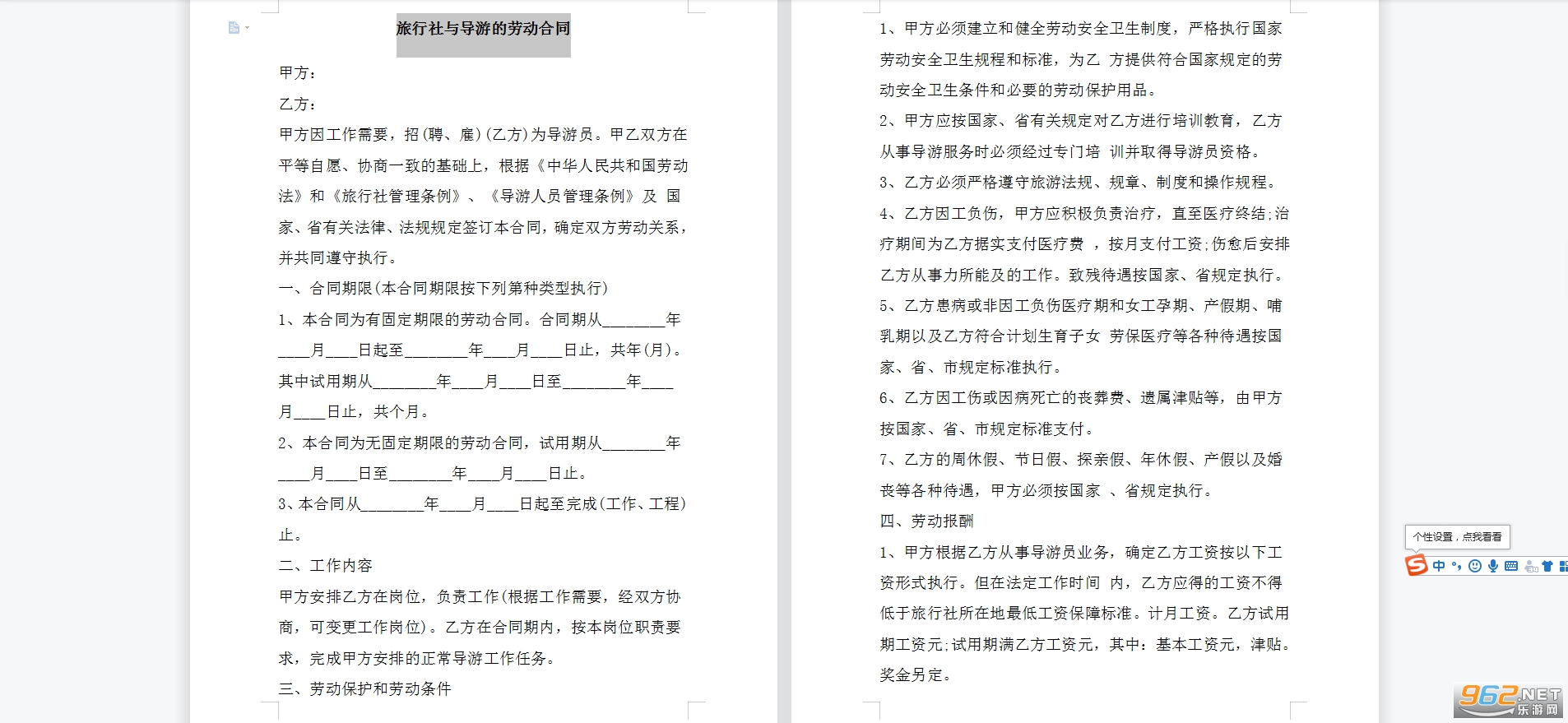 甲方因工作需要,招(聘、雇)(乙方)为导游员。甲乙双方在平等自愿、协商一致的基础上,根据《中华人民共和国劳动法》和《旅行社管理条例》、《导游人员管理条例》及 国家、省有关法律、法规规定签订本合同,确定双方劳动关系,并共同遵守执行。