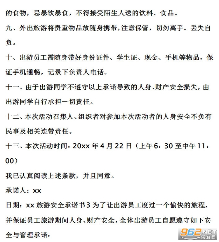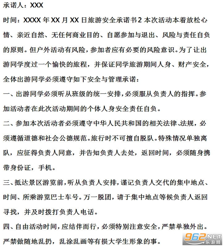 旅游安全承诺书范文预览