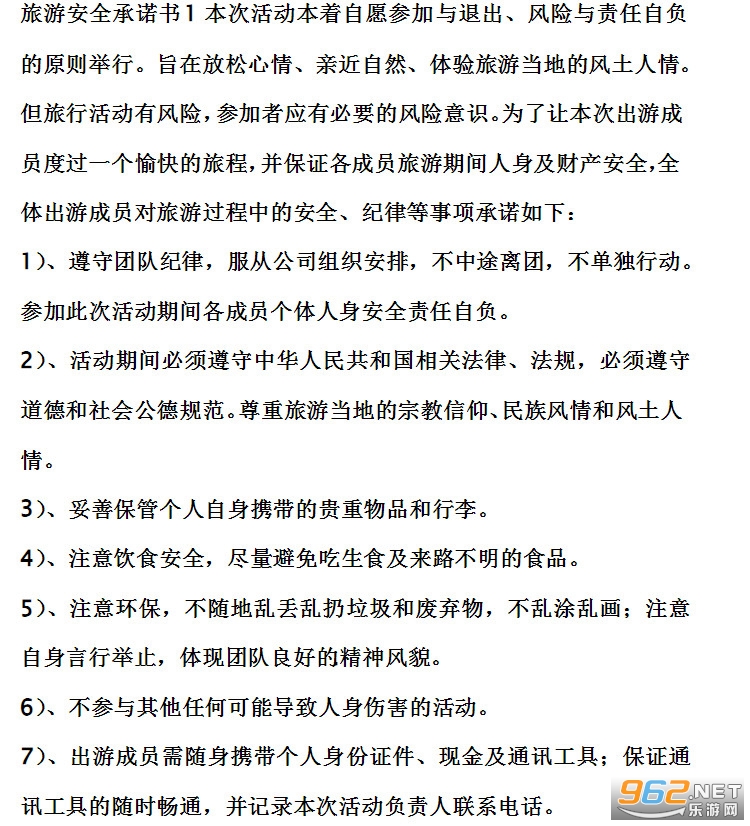 本次活动本着自愿参加与退出、风险与责任自负的原则举行。旨在放松心情、亲近自然、体验旅游当地的风土人情。但旅行活动有风险,参加者应有必要的风险意识。为了让本次出游成员度过一个愉快的旅程,并保证各成员旅游期间人身及财产安全,全体出游成员对旅游过程中的安全、纪律等事项承诺如下: