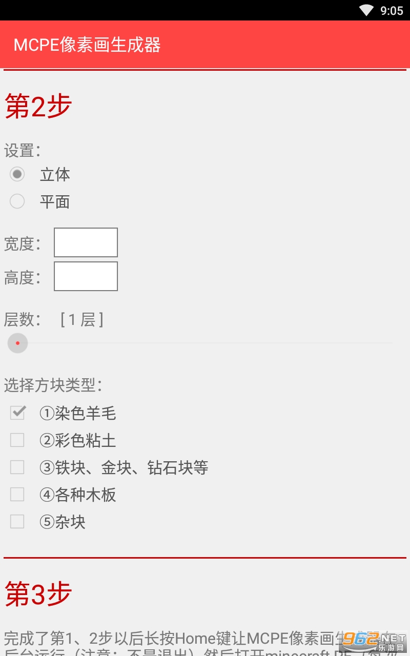 3、请记住,一个Minecraft PE的世界高度是为128块方块,所以在选择立体生成的时候宽度和高度不能超过128