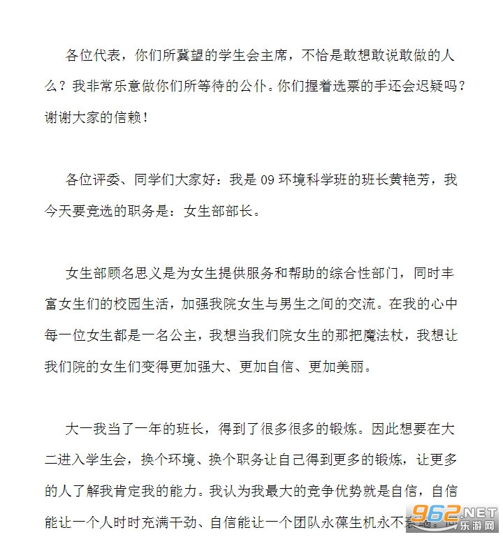 各位评委、同学们大家好:我是09环境科学班的班长黄艳芳,我今天要竞选的职务是:女生部部长女生部顾名思义是为女生提供服务和帮助的综合性部门,同时丰富女生们的校园生活,加强我院女生与男生之间的交流。