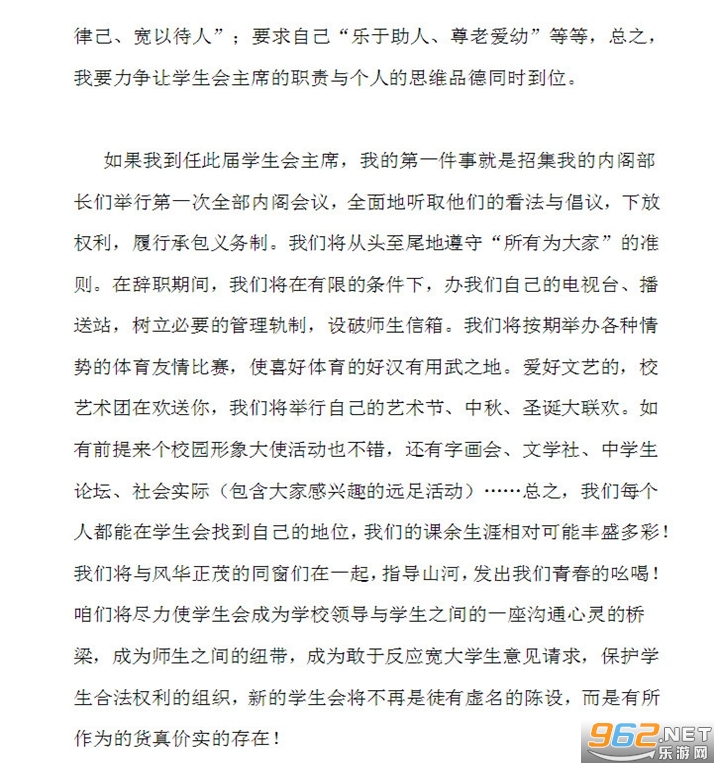 我以为本人很合适担负学生会主席。首先我酷爱我的工作,算上小学的话,十年学生干部“工龄”已不算短了,这使我有了相称的治理教训、引导才能。活跃豁达、兴致普遍的我踊跃参加并组织开展各项活动,在活动中纵情发挥自己的唱歌、舞蹈、弹钢琴及报告的才干,获得了如竞赛第一、英语朗读、浏览比赛第一等好成绩,鼓励着我一直向前;主持也是我不懈的寻求,从高一入学军训联欢会到主持省武高电视台节目,及后来的首届英语节,大大小小的运动加入了不少,是省武高这方热土给我供给了机遇,使我如鱼得水,不断锤炼、空虚着自己。此外,在活动进程中,我学习上也涓滴不松散,成就现已跻身年级前茅,我认为我有着足够的时光跟精神在学习之余发展活动如果我入选,我将进一步增强自身涵养,努力进步和完美本身的素质,我将时时要求自己“待人正派、公平办事”;要求自己“严于律己、宽以待人”;要求自己“乐于助人、尊老爱幼”等等,总之,我要力争让学生会主席的职责与个人的思维品德同时到位