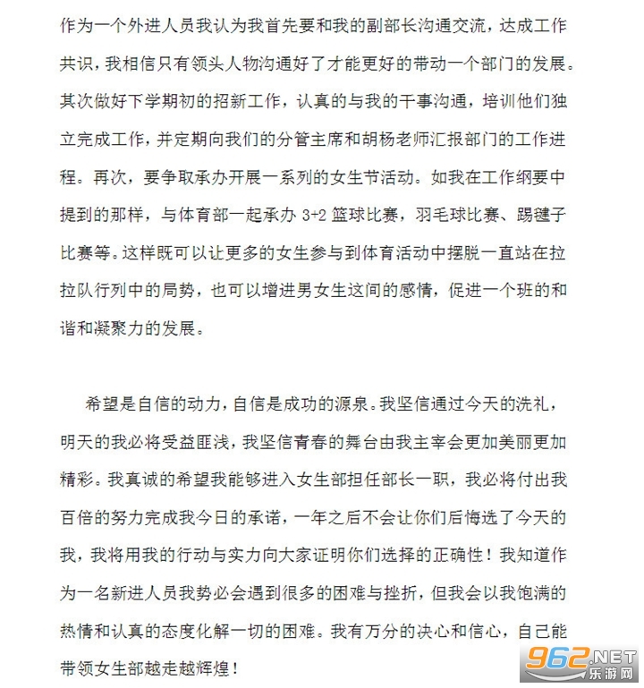 学生会是一个卧虎藏龙,高手如云的地方,我希望不仅能和本部门的同学一起团结工作,彼此学习,而且也可以和其他各部门的成员互相交流,沟通思想,汲取更为丰富的精神营养。