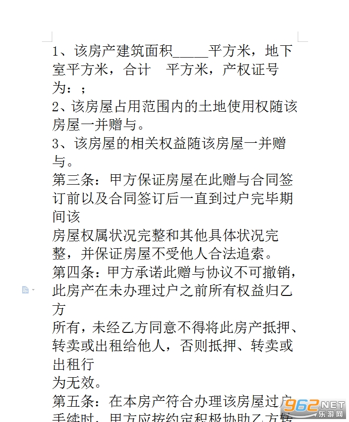第四条:甲方承诺此赠与协议不可撤销,此房产在未办理过户之前所有权益归乙方所有,未经乙方同意不得将此房产抵押、转卖或出租给他人,否则抵押、转卖或出租行为无效。
