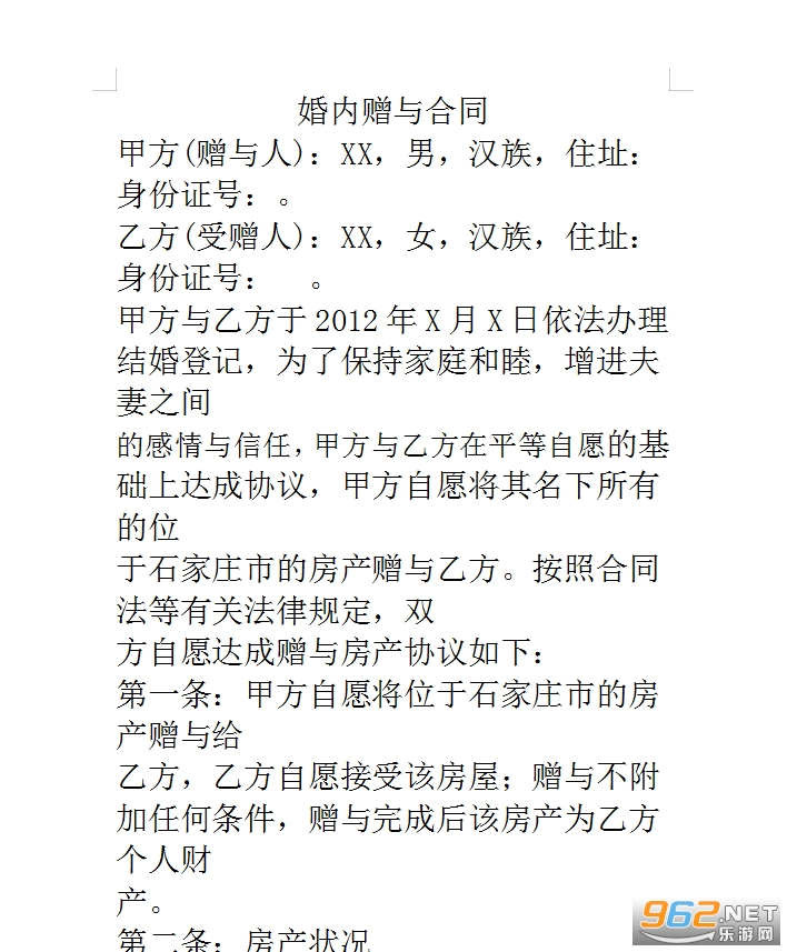 乙方(受赠人):XX,女,汉族,住址:身份证号: