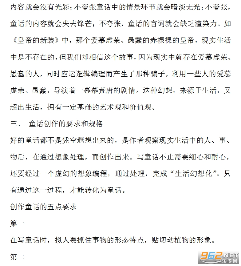 写童话故事就离不开幻想,幻想离不开夸张。有意夸大缩小是一种修辞手法,而幻想和夸张,则是童话的两只“翅膀”,不夸张,幻想的内容就会没有光彩;不夸张童话中的情景环节就会暗淡无光;不夸张,童话的内容就会失去锋芒;不夸张,童话的言词就会缺乏渲染力。如《皇帝的新装》中,那个爱慕虚荣、愚蠢的赤裸裸的皇帝,现实生活中是不存在的,但我们却相信这个故事,因为现实中就存在爱慕虚荣、愚蠢的人,同时应运逻辑编理而产生了那种骗子,利用一些人的爱慕虚荣、愚蠢,导演着一幕幕荒唐的剧情。这种幻想,来源于生活,又超出生活,拥有一定基础的艺术观和价值观。