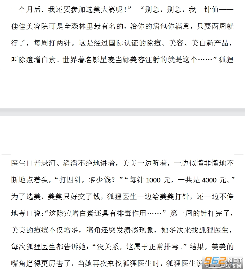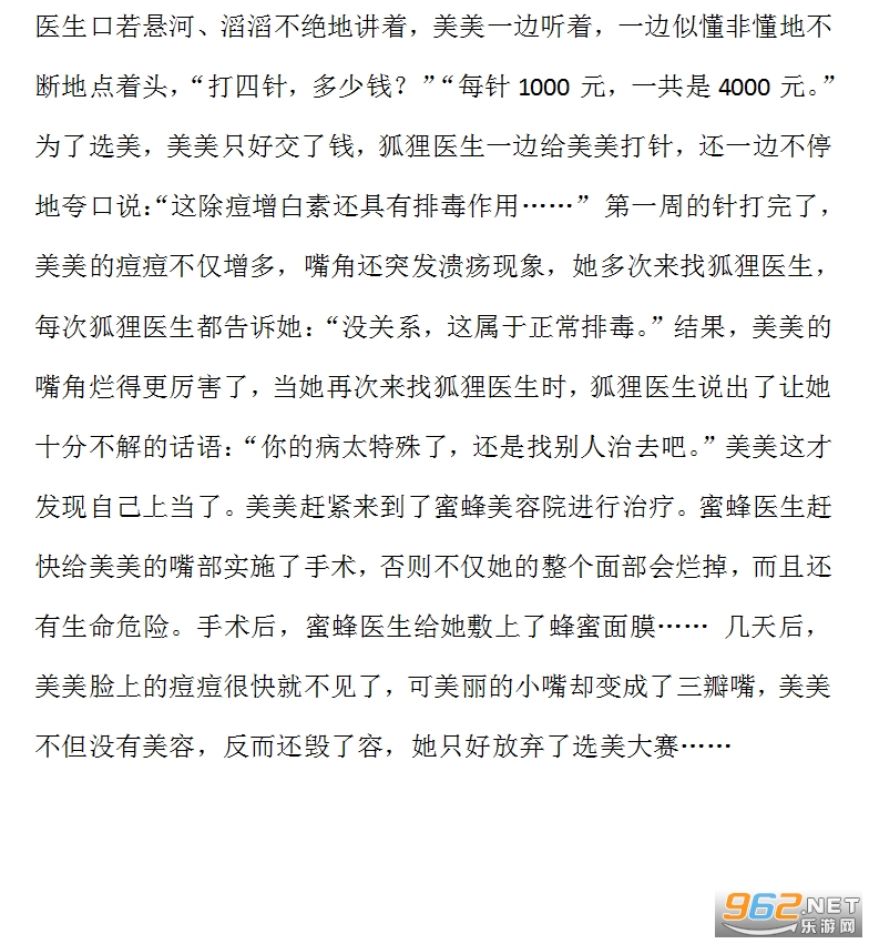 世界著名影星麦当娜美容注射的就是这个……”狐狸医生口若悬河、滔滔不绝地讲着,美美一边听着,一边似懂非懂地不断地点着头,“打四针,多少钱?”“每针1000元,一共是4000元。”为了选美,美美只好交了钱,狐狸医生一边给美美打针,还一边不停地夸口说:“这除痘增白素还具有排毒作用……”&8194;第一周的针打完了,美美的痘痘不仅增多,嘴角还突发溃疡现象,她多次来找狐狸医生,每次狐狸医生都告诉她:“没关系,这属于正常排毒。”结果,美美的嘴角烂得更厉害了,当她再次来找狐狸医生时,狐狸医生说出了让她十分不解的话语:“你的病太特殊了,还是找别人治去吧。”美美这才发现自己上当了。美美赶紧来到了蜜蜂美容院进行治疗。蜜蜂医生赶快给美美的嘴部实施了手术,否则不仅她的整个面部会烂掉,而且还有生命危险。手术后,蜜蜂医生给她敷上了蜂蜜面膜……&8194;几天后,美美脸上的痘痘很快就不见了,可美丽的小嘴却变成了三瓣嘴,美美不但没有美容,反而还毁了容,她只好放弃了选美大赛……&8194;