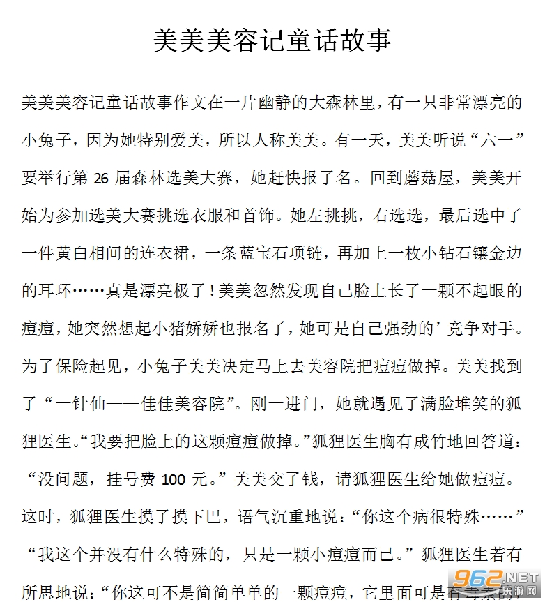 《美美美容记童话故事》是小编收集到的一篇非常不错的童话故事的范本内容,范本的用法还是很简单的,而且操作起来也非常的不错,里面的故事十分的有趣,篇幅也比较的短,感兴趣的亲们赶紧下载吧。