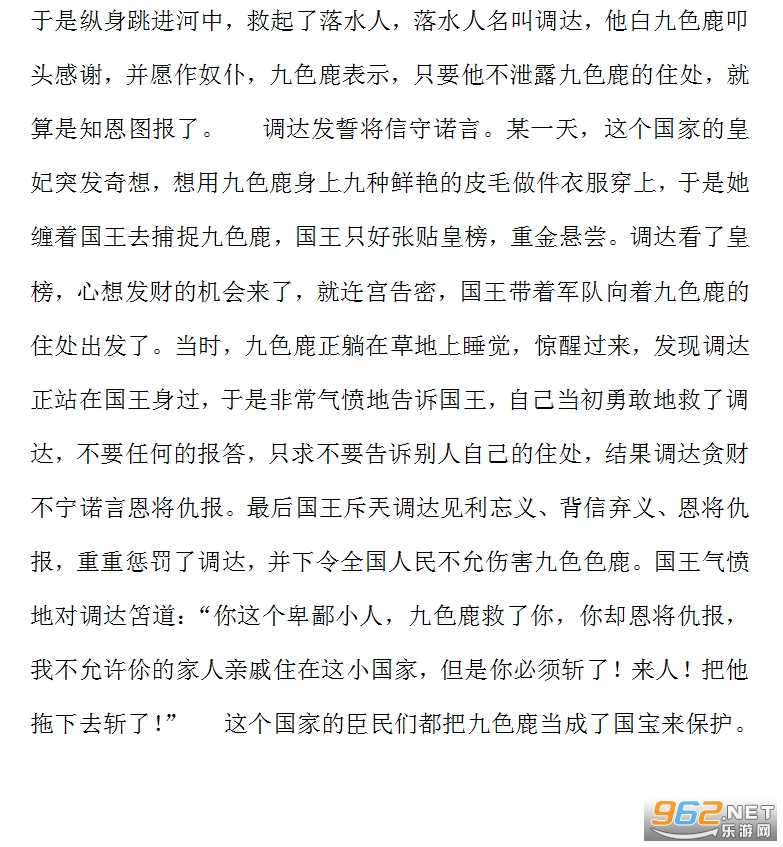 九色鹿童话故事1&8194;从前,在恒河边的树林里,有一只美丽善良的九色鹿。它和黄莺是好朋友。一天,九色鹿在恒河边喝水,忽听远处传来一阵呼救声。九色鹿急忙寻着呼救声向前跑去,只见一个人落入水中。九色鹿不顾自己的安危冲进河里,将落水人救上了岸。落水人昏迷不醒,九色鹿又跑上山,衔来灵芝草,救活了落水人。落水人对天发誓,一定要报答九色鹿。九色鹿说:你只要不告诉别人,我在这里就是对我的.报答了。落水人千恩万谢地走了。他路过京城时,见城门口贴着一张皇榜。皇榜上写着:献上九色鹿,封官赏钱。原来是王后想用九色鹿的毛皮做一件华丽的衣服,她还做了一个美梦,梦见自己穿着鹿皮大衣和仙女们在天空中飞行。&8194;&8194;&8194;落水人揭了皇榜,向国王禀报了九色鹿的行踪。