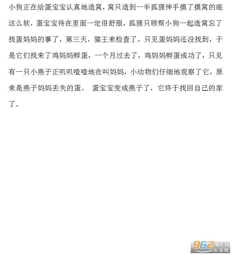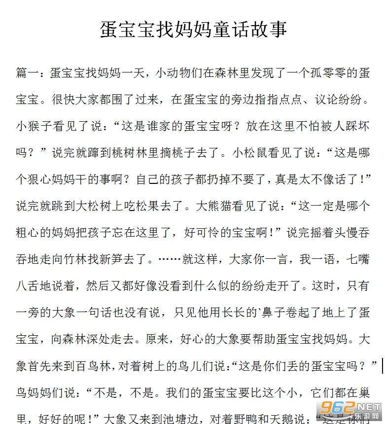 《蛋宝宝找妈妈童话故事》是小编在网上找到的一篇关于蛋宝宝找妈妈的童话故事,故事整体的节奏还是很不错的,寓意也非常的正向,而且有种温馨的感觉,排版没怎么做,感兴趣的亲们赶紧下载吧。