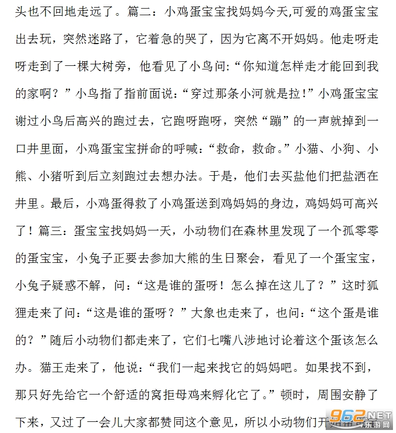 篇一:蛋宝宝找妈妈一天,小动物们在森林里发现了一个孤零零的蛋宝宝。很快大家都围了过来,在蛋宝宝的旁边指指点点、议论纷纷。小猴子看见了说:“这是谁家的蛋宝宝呀?放在这里不怕被人踩坏吗?”说完就蹿到桃树林里摘桃子去了。小松鼠看见了说:“这是哪个狠心妈妈干的事啊?自己的孩子都扔掉不要了,真是太不像话了!”说完就跳到大松树上吃松果去了。大熊猫看见了说:“这一定是哪个粗心的妈妈把孩子忘在这里了,好可怜的宝宝啊!”说完摇着头慢吞吞地走向竹林找新笋去了。……就这样,大家你一言,我一语,七嘴八舌地说着,然后又都好像没看到什么似的纷纷走开了。这时,只有一旁的大象一句话也没有说,只见他用长长的`鼻子卷起了地上了蛋宝宝,向森林深处走去。原来,好心的大象要帮助蛋宝宝找妈妈。大象首先来到百鸟林,对着树上的鸟儿们说:“这是你们丢的蛋宝宝吗?”鸟妈妈们说:“不是,不是。我们的蛋宝宝要比这个小,它们都在巢里,好好的呢!”大象又来到池塘边,对着野鸭和天鹅说:“这是你们丢的蛋宝宝吗?”野鸭和天鹅说:“不是,不是。我们的蛋宝宝要比这个大,它们都在窝里,安全着呢!”就在这时,远处传来了一阵阵哭声,原来是乌龟妈妈正在找自己的蛋宝宝呢。大象连忙走过去,一边用鼻子把蛋宝宝轻轻地放在乌龟妈妈面前,一边长舒了一口气地说:“别着急,乌龟妈妈。你的蛋宝宝在这儿呢。”&8194;乌龟妈妈看到自己的蛋宝宝失而复得,安然无恙,激动地正想感谢大象时,发现大象已经头也不回地走远了。篇二:小鸡蛋宝宝找妈妈今天,可爱的鸡蛋宝宝出去玩,突然迷路了,它着急的哭了,因为它离不开妈妈。他走呀走呀走到了一棵大树旁,他看见了小鸟问:“你知道怎样走才能回到我的家啊?”小鸟指了指前面说:“穿过那条小河就是拉!”小鸡蛋宝宝谢过小鸟后高兴的跑过去,它跑呀跑呀,突然“蹦”的一声就掉到一口井里面,小鸡蛋宝宝拼命的呼喊:“救命,救命。”小猫、小狗、小熊、小猪听到后立刻跑过去想办法。于是,他们去买盐他们把盐洒在井里。最后,小鸡蛋得救了小鸡蛋送到鸡妈妈的身边,鸡妈妈可高兴了!篇三:蛋宝宝找妈妈一天,小动物们在森林里发现了一个孤零零的蛋宝宝,小兔子正要去参加大熊的生日聚会,看见了一个蛋宝宝,小兔子疑惑不解,问:“这是谁的蛋呀!怎么掉在这儿了?”这时狐狸走来了问:“这是谁的蛋呀?”大象也走来了