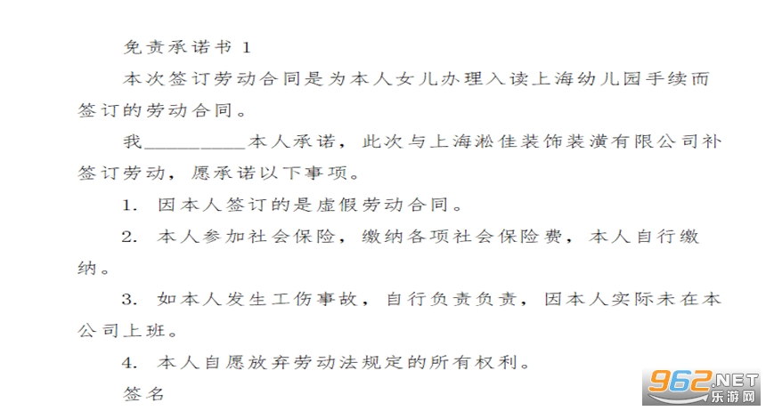 本次签订劳动合同是为本人女儿办理入读上海幼儿园手续而签订的劳动合同。