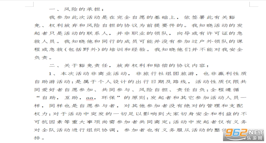 我参加此次活动是在完全自愿的基础上,依签署此有关豁免、权利放弃和风险自担的协议为前提要件的。我知晓活动的发起者只是活动的联系人,并非职业的领队,向导或有许可证的急救人员。我知晓他和同行的成员可能并没有参加过户外领队的课程或急救(包括野外)的培训和经验。我知晓他们并不能对我安全负责。