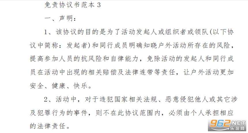 4、此协议为相关责任的豁免,权利的放弃,风险的承担和免赔的协议。你如果在此协议上签字,你就已经完全知晓、理解和同意接受《户外活动免责协议书》全部条款,你就放弃了向活动发起者和其他参加成员提起诉讼的权利;永远免除此次活动的发起者和同行成员的赔偿及法律连带责任。