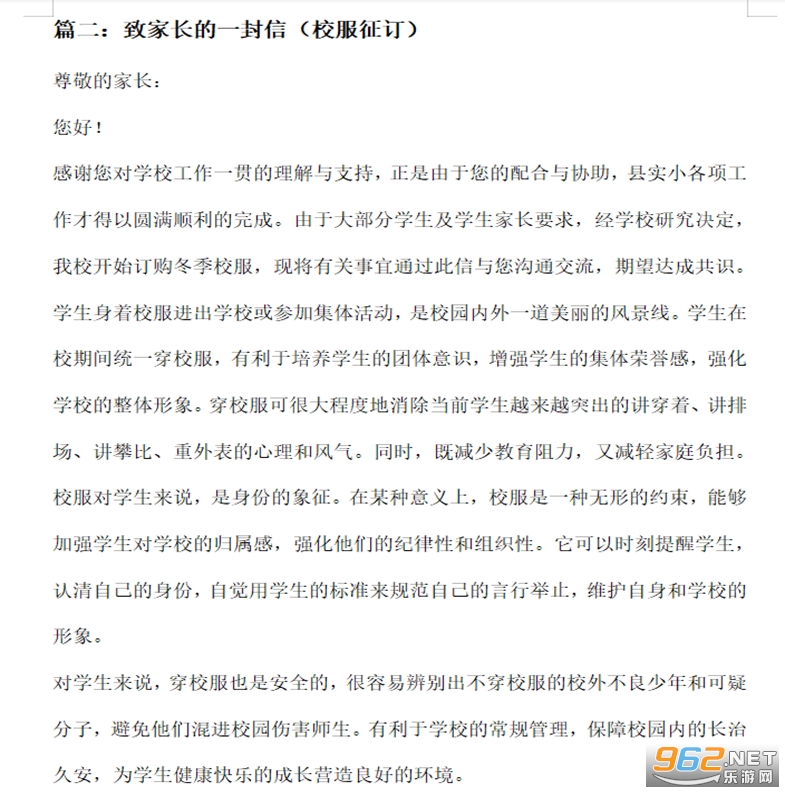 感谢您对学校工作一贯的理解与支持,正是由于您的配合与协助,县实小各项工作才得以圆满顺利的完成。由于大部分学生及学生家长要求,经学校研究决定,我校开始订购冬季校服,现将有关事宜通过此信与您沟通交流,期望达成共识。