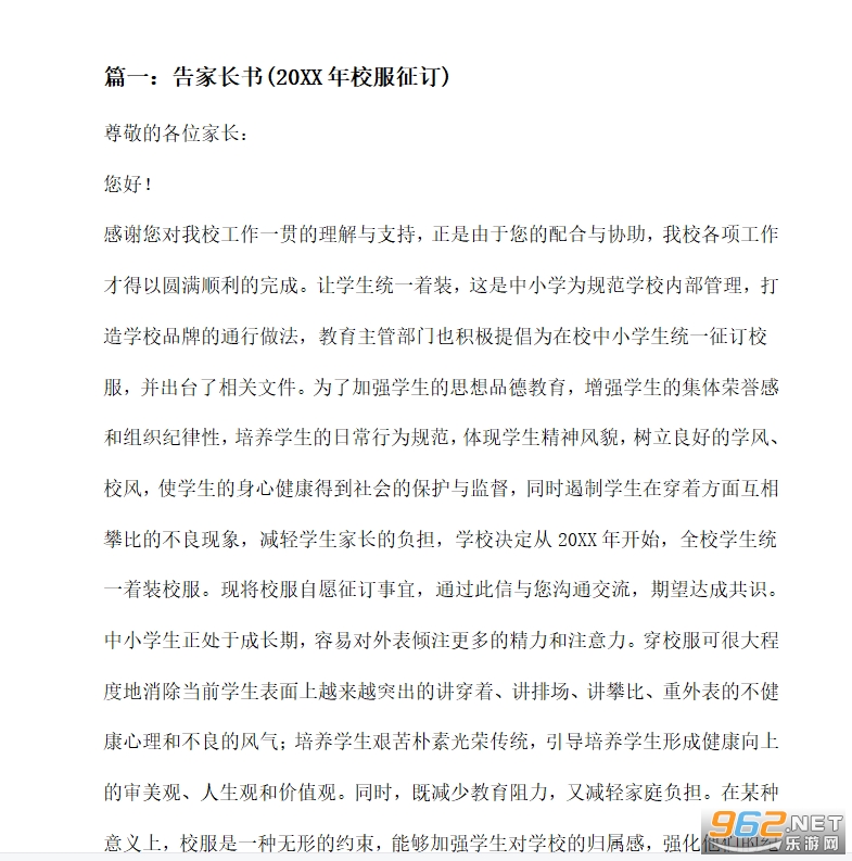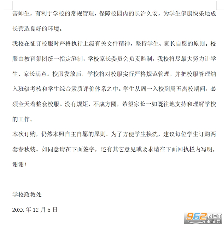 感谢您对我校工作一贯的理解与支持,正是由于您的配合与协助,我校各项工作才得以圆满顺利的完成。让学生统一着装,这是中小学为规范学校内部管理,打造学校品牌的通行做法,教育主管部门也积极提倡为在校中小学生统一征订校服,并出台了相关文件。为了加强学生的思想品德教育,增强学生的集体荣誉感和组织纪律性,培养学生的日常行为规范,体现学生精神风貌,树立良好的学风、校风,使学生的身心健康得到社会的保护与监督,同时遏制学生在穿着方面互相攀比的不良现象,减轻学生家长的负担,学校决定从20XX年开始,全校学生统一着装校服。现将校服自愿征订事宜,通过此信与您沟通交流,期望达成共识。