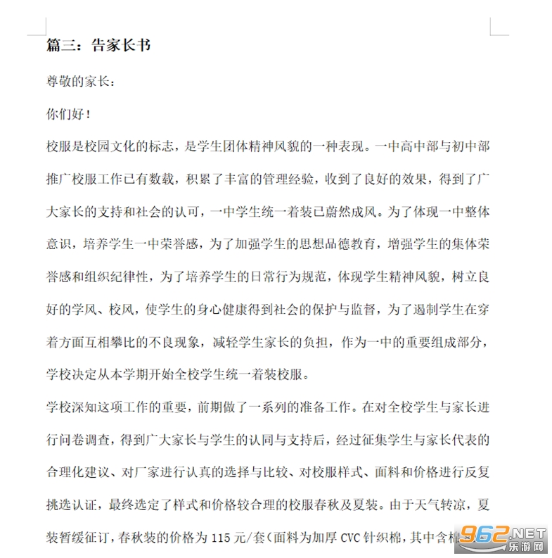 中小学校服征订告家长书模板三: