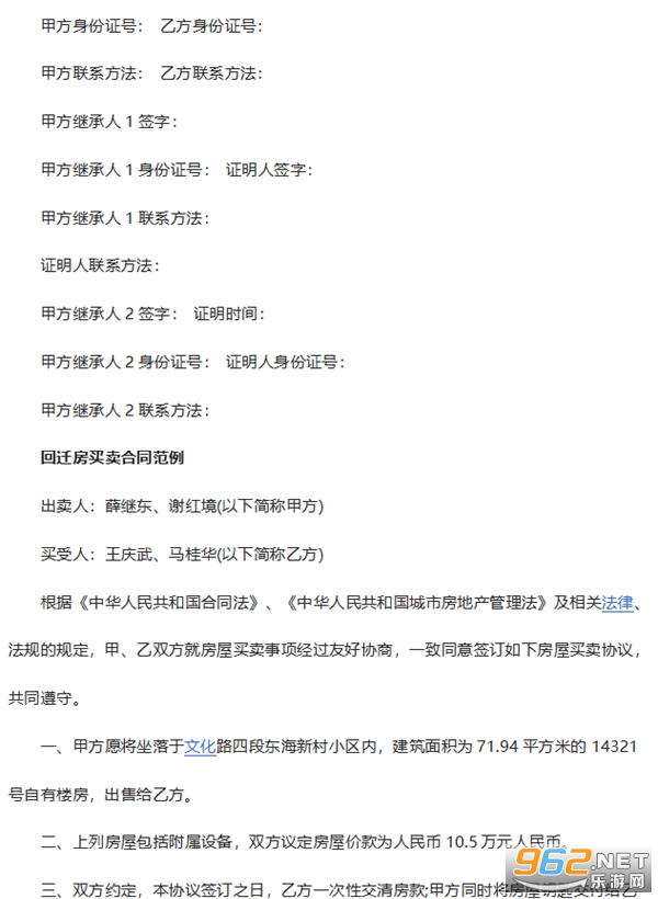 1、因甲方的房屋被依法迁,甲方自愿将其回迁的楼房转让给乙方。乙方取得房屋后,甲方不得以任何理由反悔。
