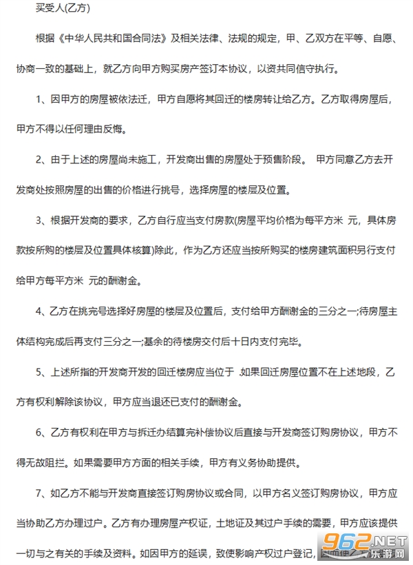 2、由于上述的房屋尚未施工,开发商出售的房屋处于预售阶段。 甲方同意乙方去开发商处按照房屋的出售的价格进行挑号,选择房屋的楼层及位置。