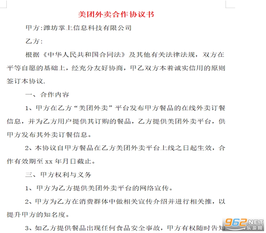 1、甲方在乙方“美团外卖”平台发布甲方餐品的在线外卖订餐信息,并为乙方用户提供其订购的餐品,乙方提供美团外卖平台,供甲方发布其外卖订餐信息。