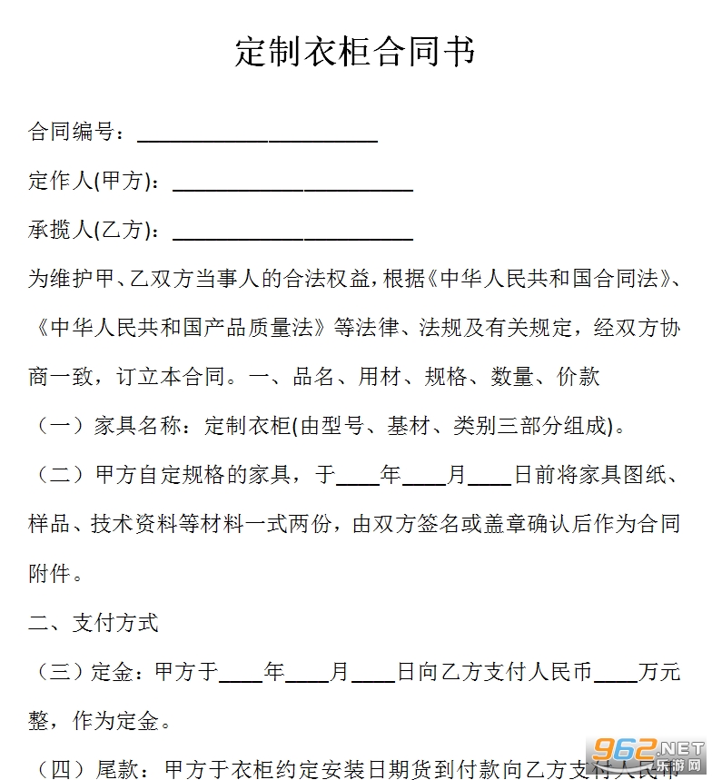 付款方式, 一般定制整体衣柜,需要交付一部分订金,不过这具体的订金占全交易金额的比例可要在合同上白纸黑字注明的一清二楚。以免日后发生纠纷。 售后服务,衣柜是大型耐用品,行业中衣柜厂家都有售后服务。整体衣柜订购合同需要事先明确规定,衣柜质保期、保修期、保修范围等等。在签订合同时,应尽量详细写明定制衣柜的内容,包括尺寸、材质、交货时间、价格、是否可以退换货等等一切,将与对方商量的所有内容,都落实在合同中,一旦发生争议,便可通过合同进行。1、应注明衣柜柜体板材的种类、型号、尺寸、价格等。 行业曾出现这样一个案例,某些无良商家欺骗顾客,挂羊头卖,对板材偷工换料。明明合同用的是禾香板,却在安装的时候用其他成本低的板材安装。