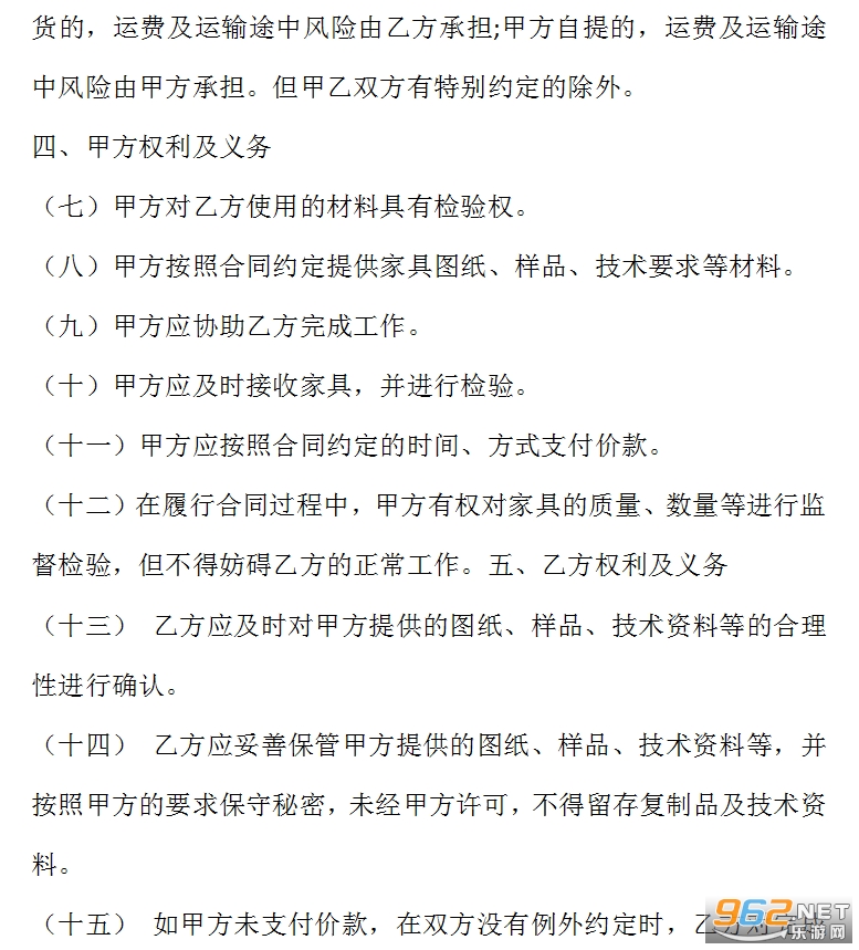 (十二)在履行合同过程中,甲方有权对家具的质量、数量等进行监督检验,但不得妨碍乙方的正常工作。五、乙方权利及义务