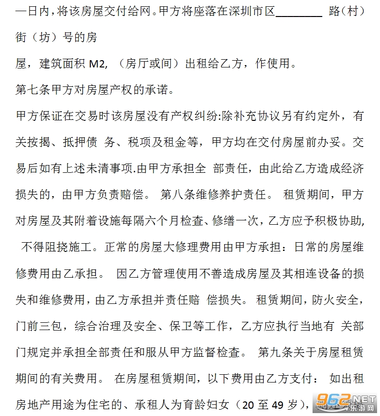 第三条租赁期限。租赁期限自—年—月—日至—年—月—日止。第四条租金该房屋月租金为(人民币)—T—百—拾元整。租赁期冋,如遇到国家有关政策调整,则按新政策规定调整租金标准;除此之外,出租方不得以任何理由任意调整租金。第五条付款方式乙方按(季)支付租金给甲方。第六条交付房屋期限。甲方应于本合同生效之日起—日内,将该房屋交付给网。甲方将座落在深圳市区________&8194;路(村)街(坊)号的房