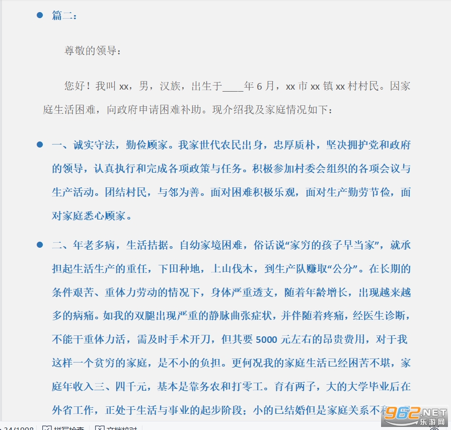 您好!我叫xx,男,汉族,出生于____年6月,xx市xx镇xx村村民。因家庭生活困难,向政府申请困难补助。现介绍我及家庭情况如下: