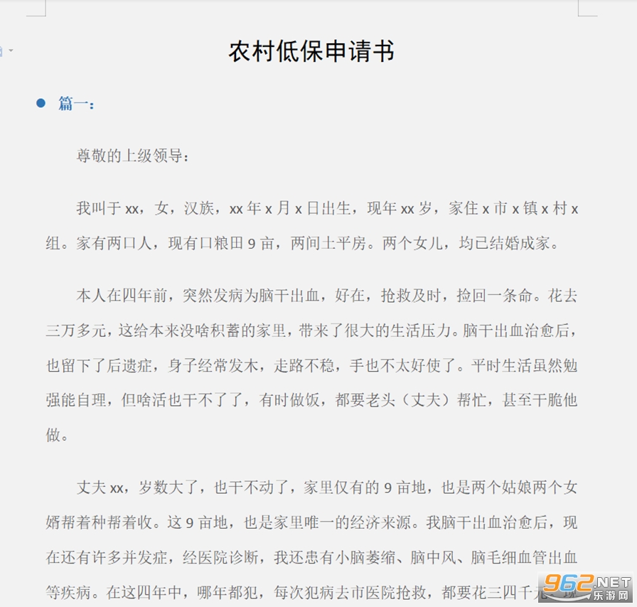 我听说党和政府对特别困难的农民有政策照顾,可以申请低保,我异常高兴。这里,我特向民政部门领导提出申请,让自己能享受农村低保待遇。热切希望领导能了解实情,批准我的申请。