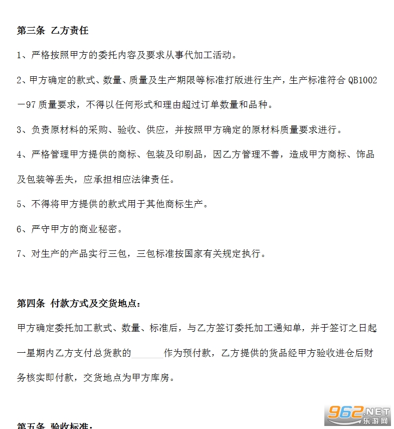 3、向乙方提供加工品款式(或开发信息)、数量、技术要求、交货时间等。