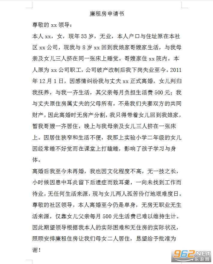 本人每月微薄的收入出去儿女每月生活费用,家中日常开支外,几乎剩不下什么钱,生活拮据,家中无任何积蓄。常年都是靠租住解决住房问题,属于无房户,在查看XX县城市廉租住房管理实施细则后,发现本人贴合申请条件,为解决全家人十分困难的住房问题,在此个性向政府申请廉租住房一套,期望政府主管部门、居委会能给予准许,解决申请人的住房实际困难,特此感谢!