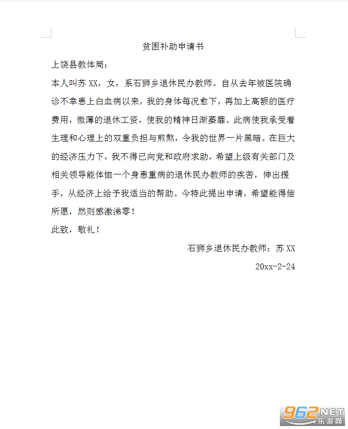 本人叫苏XX,女,系石狮乡退休民办教师。自从去年被医院确诊不幸患上白血病以来,我的身体每况愈下,再加上高额的医疗费用,微薄的退休工资,使我的精神日渐萎靡。此病使我承受着生理和心理上的双重负担与煎熬,令我的世界一片黑暗。在巨大的经济压力下,我不得已向党和政府求助,希望上级有关部门及相关领导能体恤一个身患重病的退休民办教师的疾苦,伸出援手,从经济上给予我适当的帮助。今特此提出申请,希望能得偿所愿,然则感激涕零!