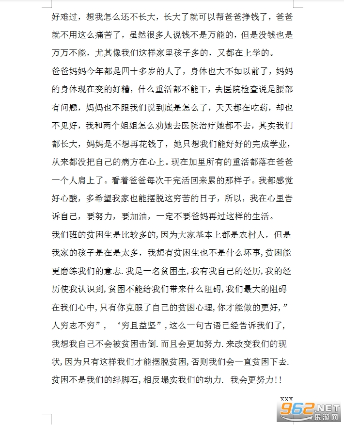 我的家坐落在xx的一个贫困地方。那是一个比较落后的地方,家里有我的爸爸,妈妈,两个姐姐和我。因为家里太穷,爷爷奶奶都在我们没出生时就去世了。很小很小时都是我妈妈一个人在家里照顾我们姐弟三个孩子,爸爸一个人在地里干活,有时候一个人忙不过来时。妈妈就把我门锁在家里帮爸爸干活,正是因为这样的家庭条件,从我懂事开始就知道父母都是认为只有凭读书走出贫穷,跳出农村。所以爸妈不尽辛苦的让我和两个姐姐上学,在农村来讲,有三个儿女可以读书的真的是件很惊奇的事情,同龄的孩子都羡慕我们,可是又有谁知道背后的父母是多么的辛苦与劳累,尤其是交通不怎么方便的农村。