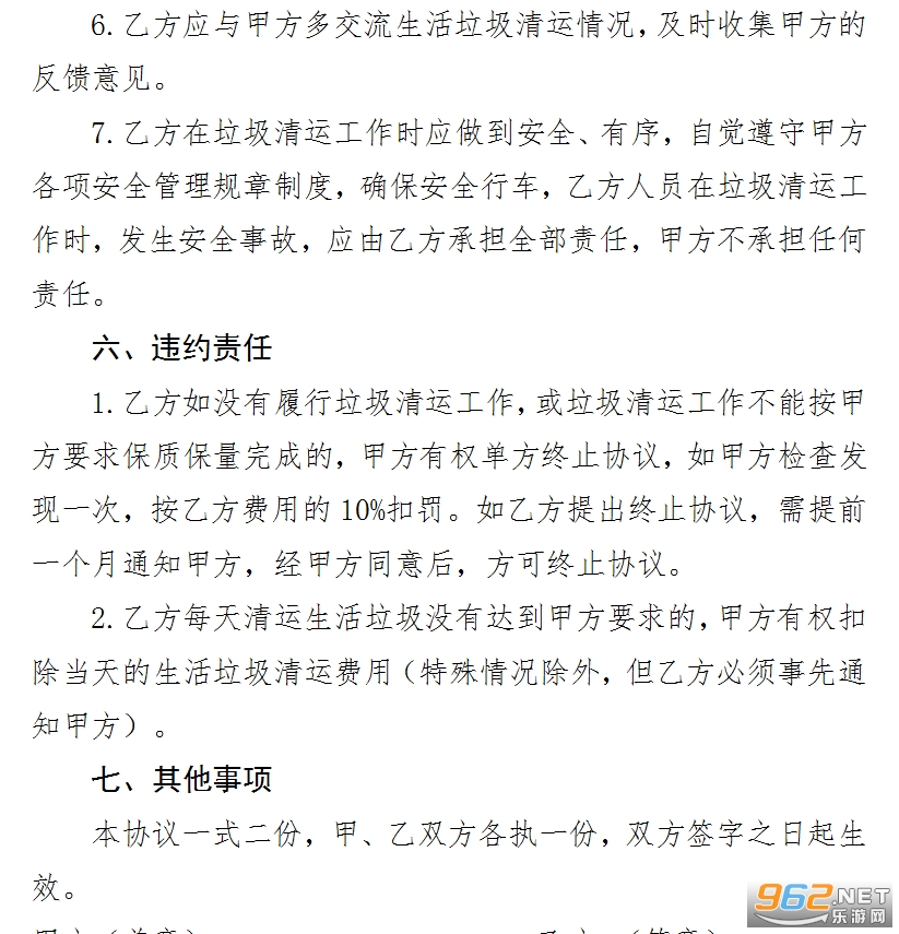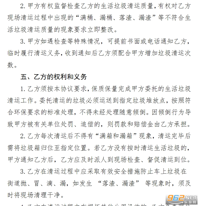 1.乙方须按本协议要求,保质保量完成甲方委托的生活垃圾清运工作。委托清运的垃圾必须运送到指定垃圾堆放点,按照符合环保要求的标准处理,不得未经处理随意倾倒。因倾倒行为导致甲方被有关单位处罚、追偿的,则罚款和赔偿金由乙方承担。