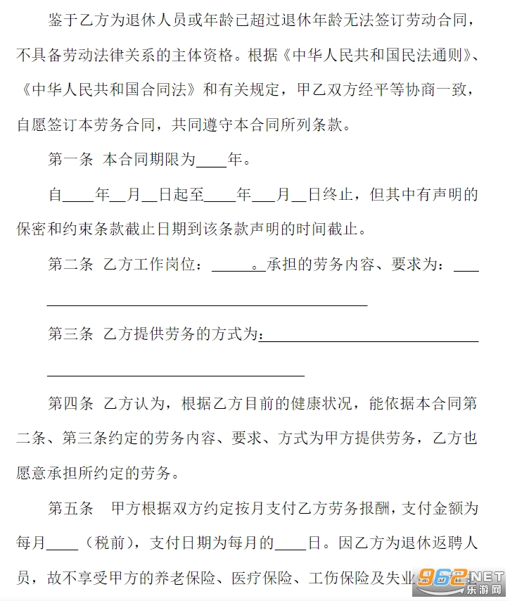 鉴于乙方为退休人员或年龄已超过退休年龄无法签订劳动合同,不具备劳动法律关系的主体资格。根据《中华人民共和国民法通则》、《中华人民共和国合同法》和有关规定,甲乙双方经平等协商一致,自愿签订本劳务合同,共同遵守本合同所列条款。