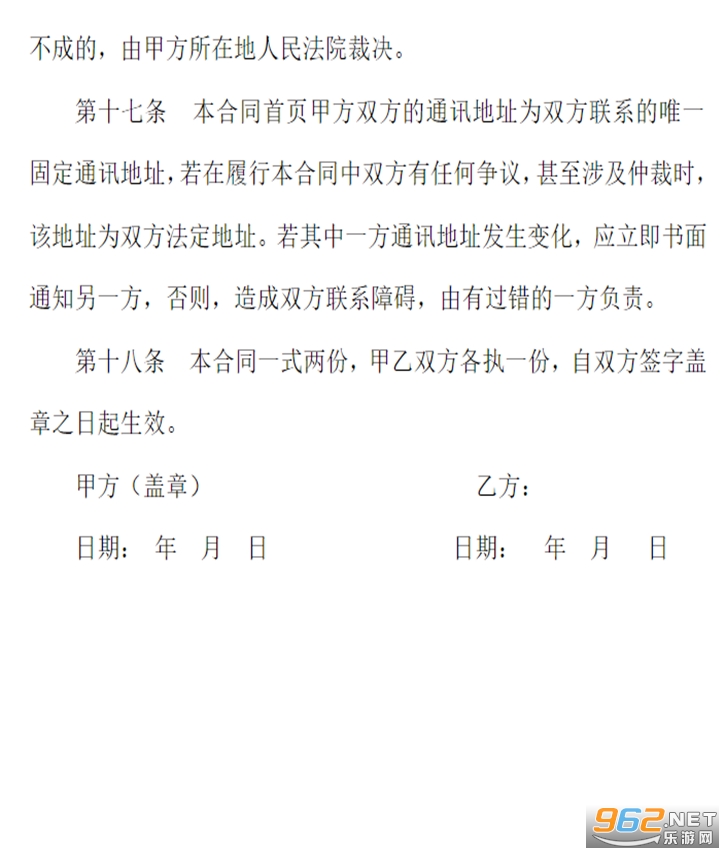 第十八条 本合同一式两份,甲乙双方各执一份,自双方签字盖章之日起生效。
